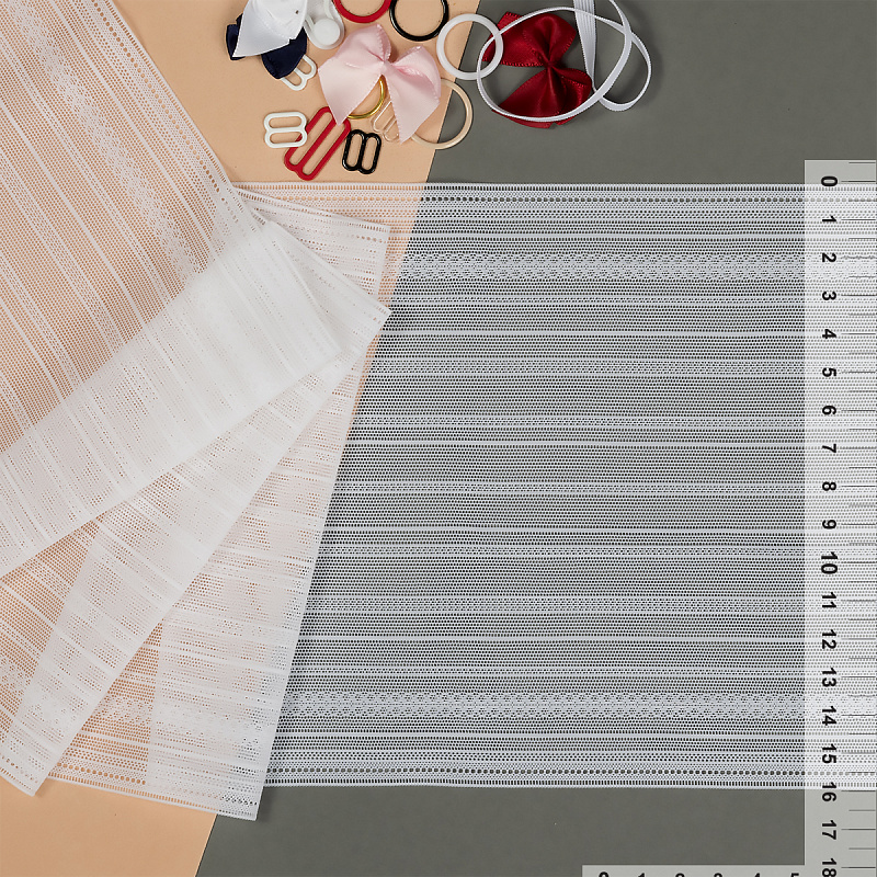 Эластичное кружево в стиле бельевой сетки. Основа у такого кружева больше похожа на утягивающую бельевую сетку. Кружево плотное, упругое — очень крутой дизайн! Будет хорошо держать форму и утягивать. Текстура гладкая, мягкая, приятная на ощупь. Идеально подойдет для трусиков, бюстгальтеров и боди. Также можно использовать как вставки для одежды.