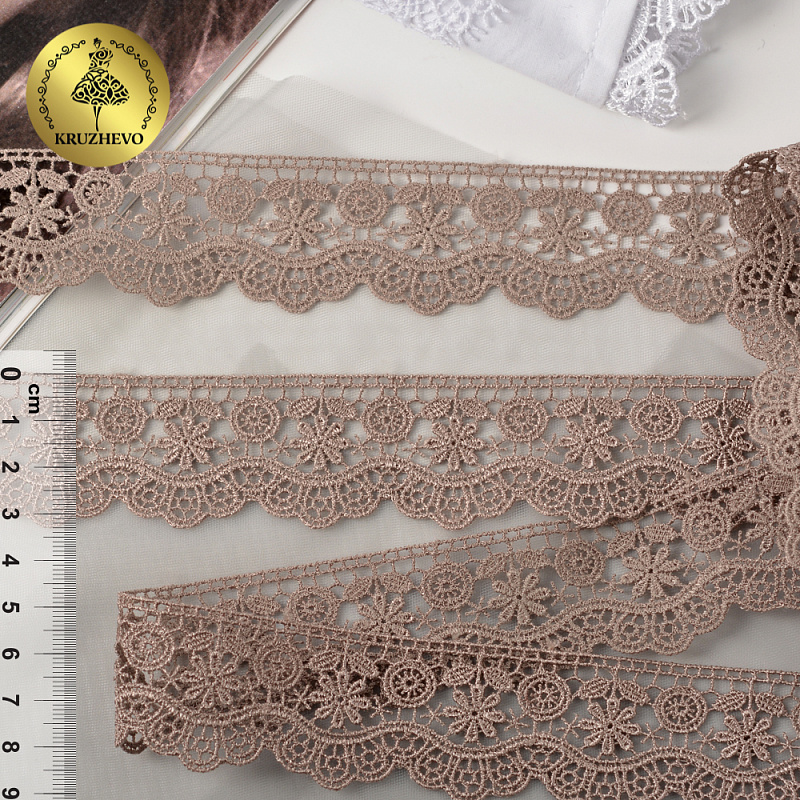 Ажурное, фактурное кружево гипюр от бренда Kruzhevo. Рисунок плотный, детально вывязанный. Отлично держит форму, при этом является достаточно гибким и удобным в работе. Подойдёт для отделки и украшения текстильных изделий, одежды и аксессуаров.