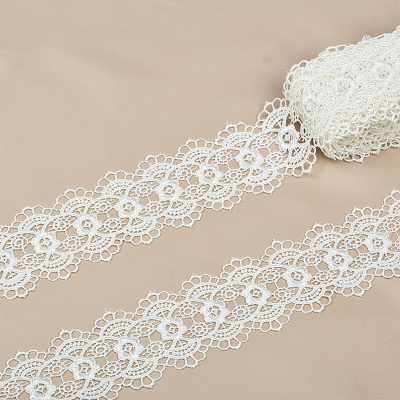 Ажурное, фактурное кружево гипюр от бренда Kruzhevo. Рисунок плотный, детально вывязанный. Отлично держит форму, при этом является достаточно гибким и удобным в работе. Подойдёт для отделки и украшения текстильных изделий, одежды и аксессуаров.
