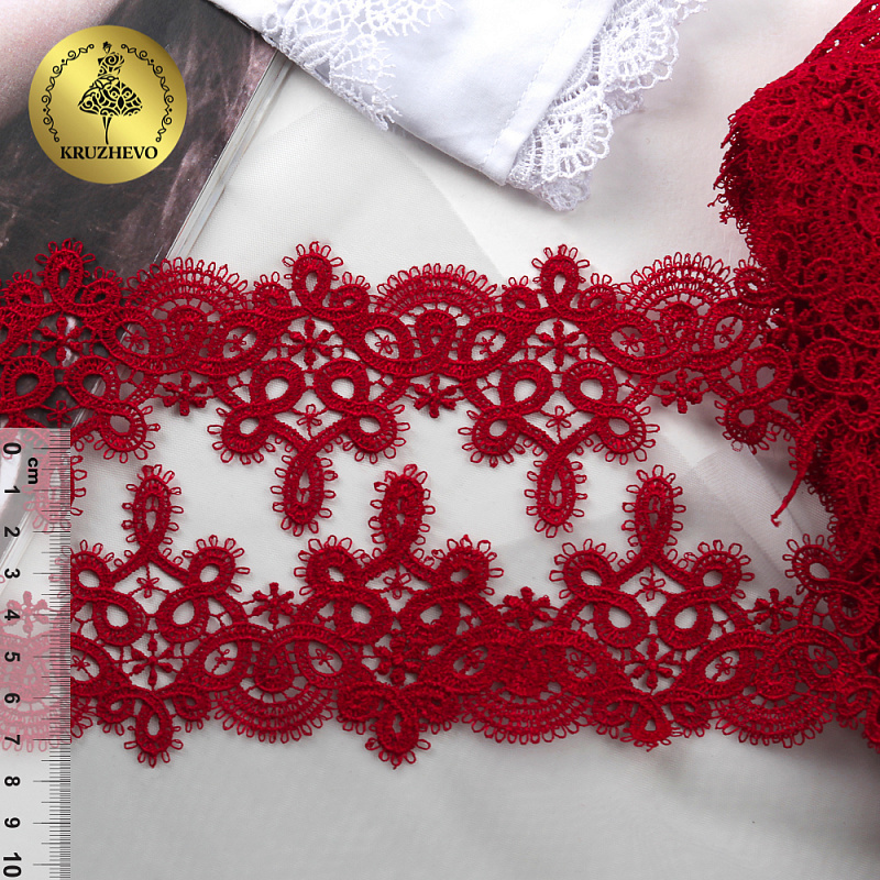 Ажурное, фактурное кружево гипюр от бренда Kruzhevo. Рисунок плотный, детально вывязанный. Отлично держит форму, при этом является достаточно гибким и удобным в работе. Подойдёт для отделки и украшения текстильных изделий, одежды и аксессуаров.