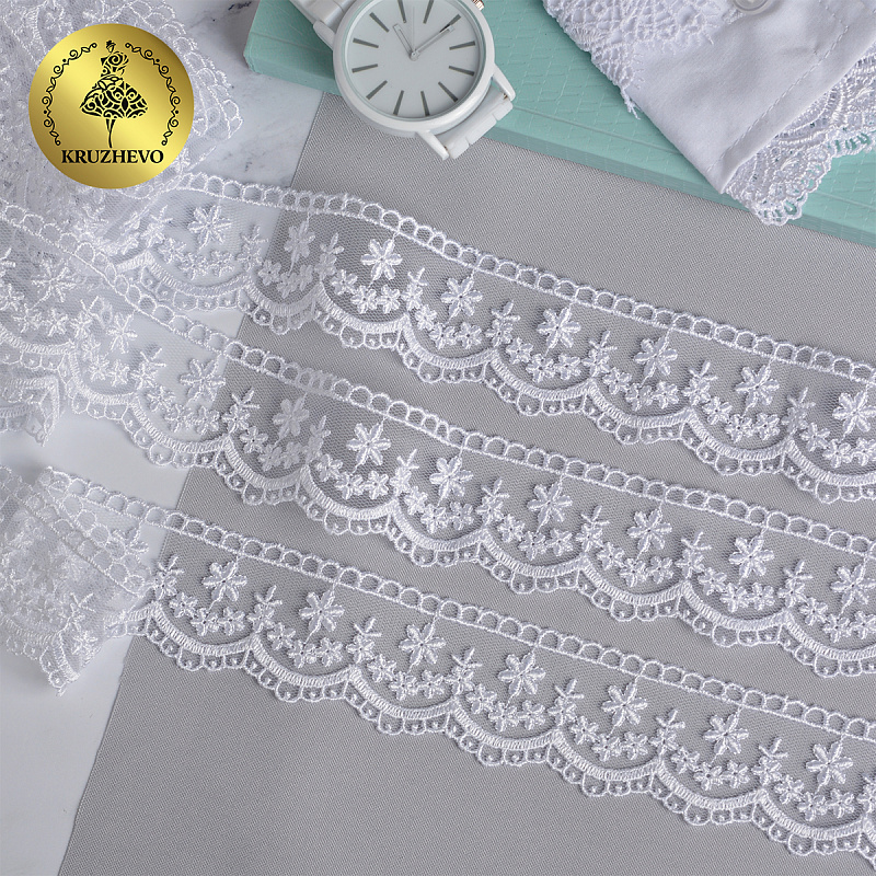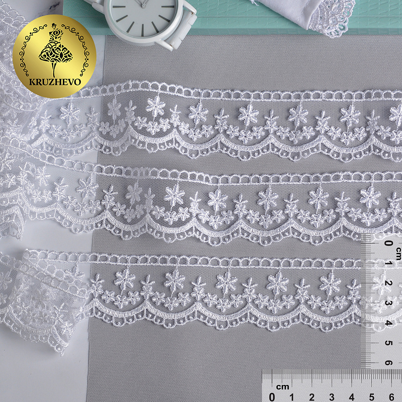 Очень красивое и нежное кружево на мягкой сетке от бренда Kruzhevo. Воздушное, тонкое, приятное на ощупь. Кружево на сетке подходит, как для шитья, отделки, так и для скрапбукинга, изготовления кукол, свадебных украшений и одежды в стиле эко, бохо и шебби-шик.