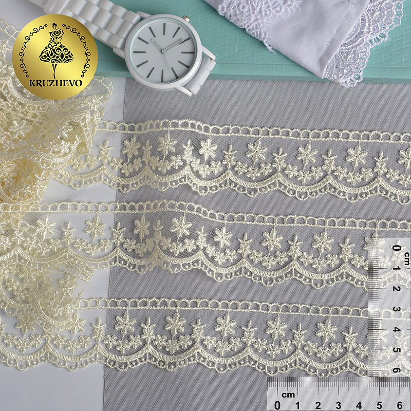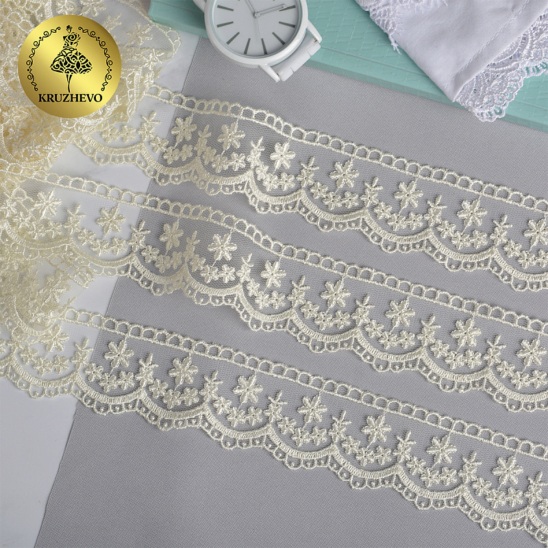 Очень красивое и нежное кружево на мягкой сетке от бренда Kruzhevo. Воздушное, тонкое, приятное на ощупь. Кружево на сетке подходит, как для шитья, отделки, так и для скрапбукинга, изготовления кукол, свадебных украшений и одежды в стиле эко, бохо и шебби-шик.
