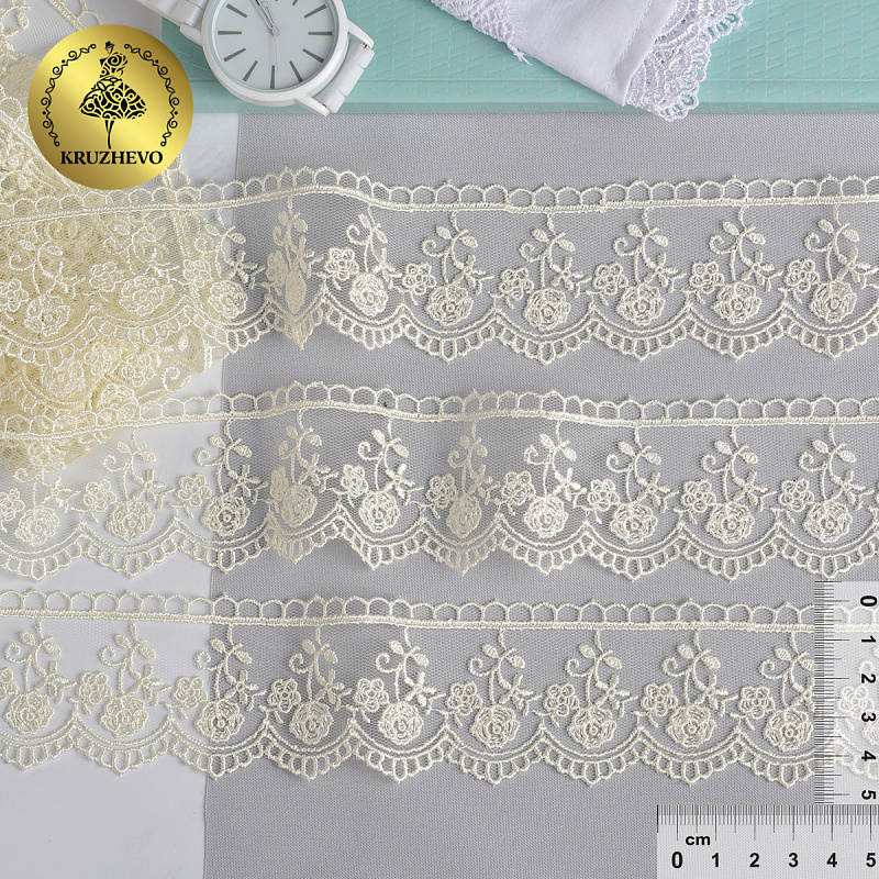 Очень красивое и нежное кружево на мягкой сетке от бренда Kruzhevo. Воздушное, тонкое, приятное на ощупь. Кружево на сетке подходит, как для шитья, отделки, так и для скрапбукинга, изготовления кукол, свадебных украшений и одежды в стиле эко, бохо и шебби-шик.