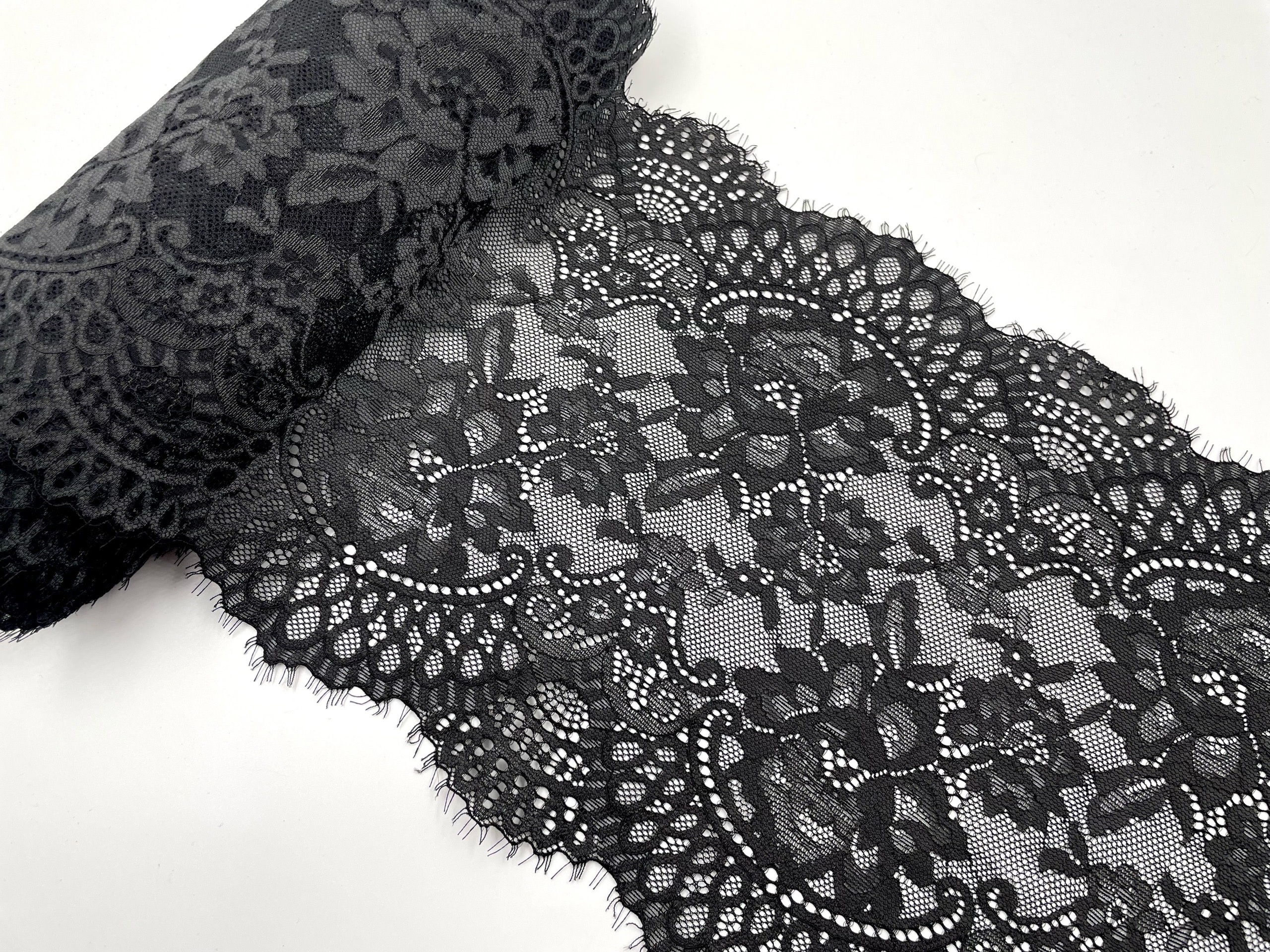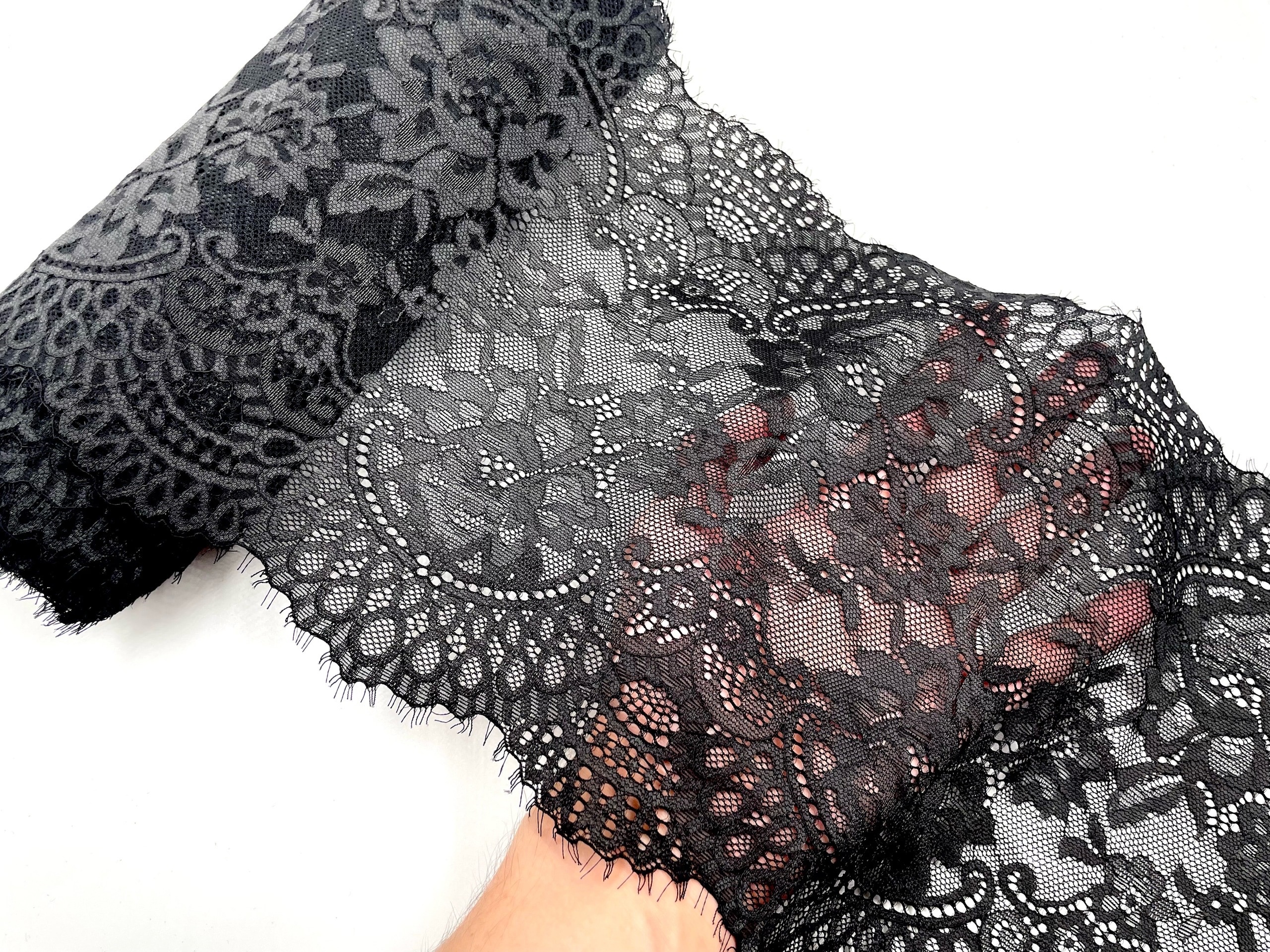 Очень нежное и воздушное эластичное кружево. Мягкое, очень приятное к телу. Хорошо тянется. Идеально подходит для нижнего белья, одежды, домашнего текстиля и других изделий.