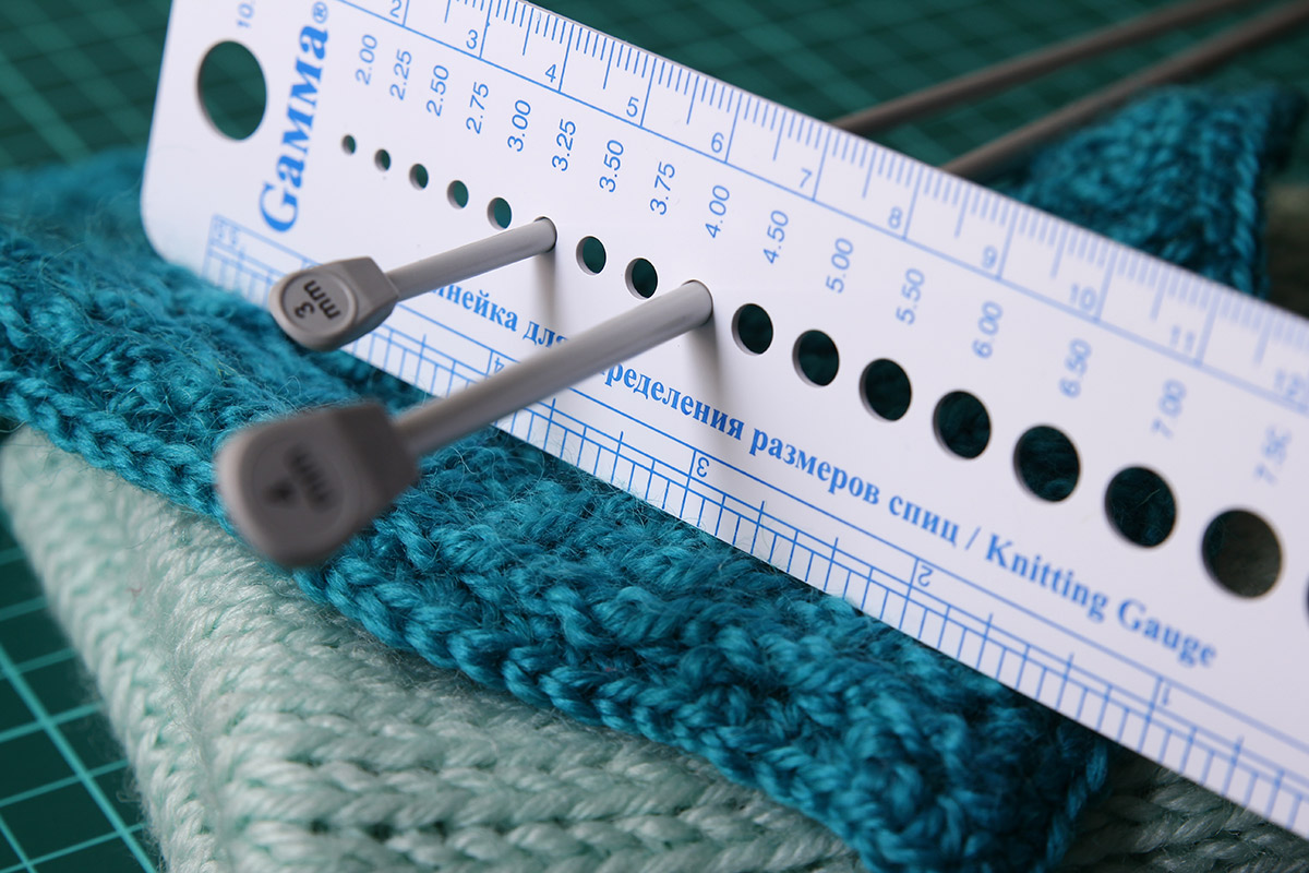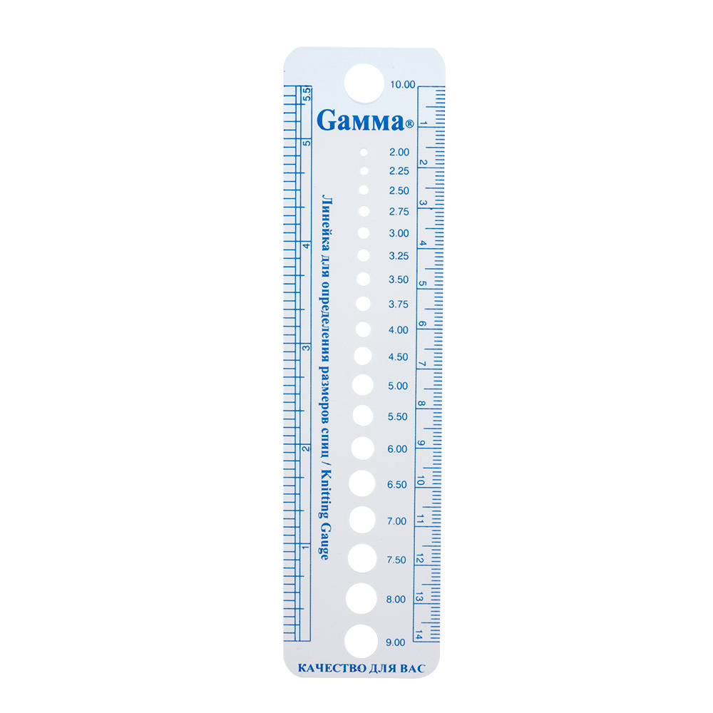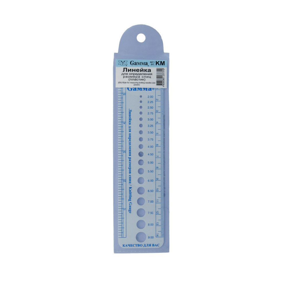 Линейка из пластика. При помощи этой линейки можно легко определить диаметр спиц, а также плотность вязания полотна /на линейке нанесена размерная шкала в см и дюймах/.