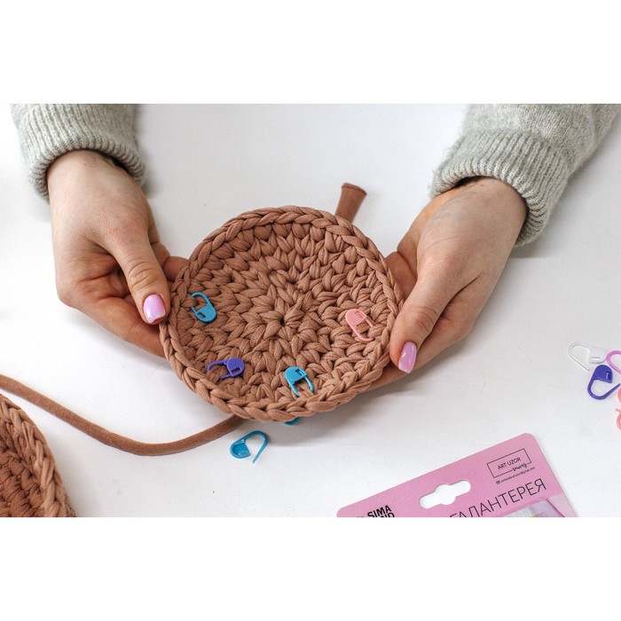 Длинный хвостик легко вдевается в петлю или столбик, затем фиксируется в замке, не деформирует и не растягивает вязку. Разными цветами удобно помечать участки в одном изделии: выделить спинку, пройму, полочку. Если допущена ошибка, можно за пару секунд снять и переставить булавку на другое место.