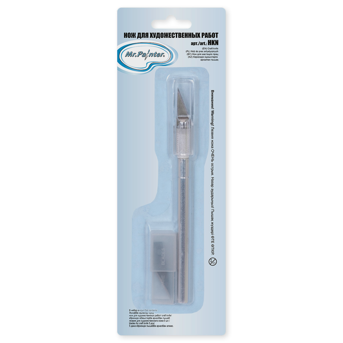 Нож для художественных работ арт. HKN имеет цанговый зажим, что обеспечивает быстроту и удобство смены лезвий ножа, которые входят в комплект набора в количестве 5 штук.