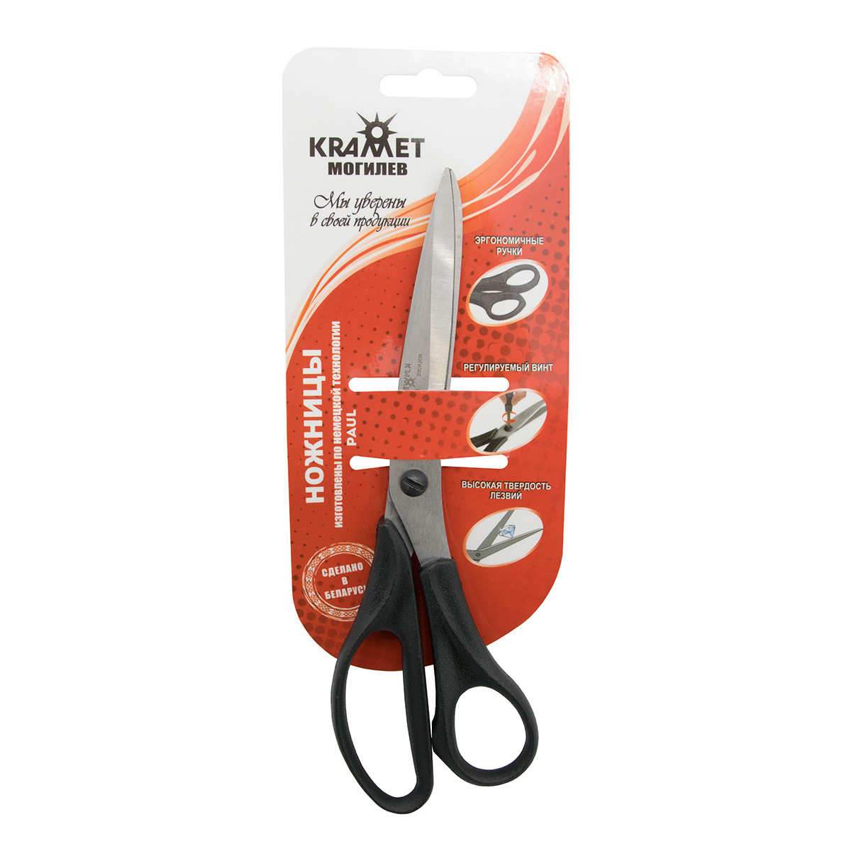 Ножницы из качественной нержавеющей стали. Натяжение между лезвиями можно настроить с помощью регулировочного винта. Подходят для работы с тканями и другими материалами различной плотности.Произведены в Республике Белорусь. Завод ‘Красный металлист’ в г. Могилеве с 1933 года выпускает широкий ассортимент ножниц из высококачественной нержавеющей стали.