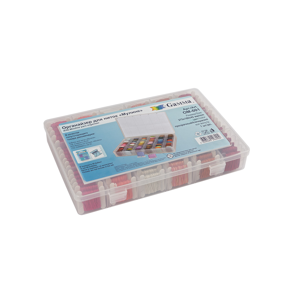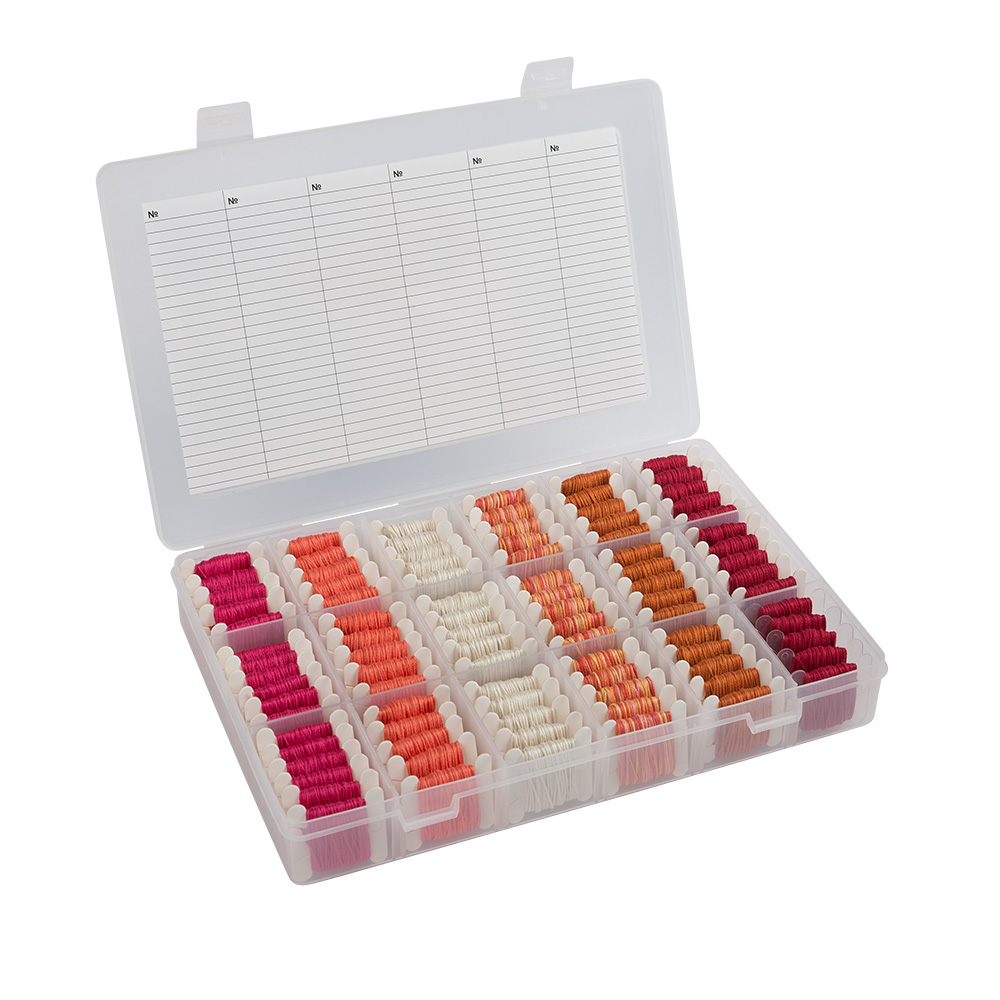 Органайзер для мулине секционный прямоугольный со съемной защелкивающейся крышкой, перегородки внутри можно устанавливать самостоятельно, формируя от 3 до 18 секций, предназначается для хранения бисера, бусин и прочих мелочей для рукоделия и шитья, вмещает в себя до 200 бобин. В комплекте 72 картонных бобин для мулине. Нитки в комплект не входят. Размеры коробки: 27.5 х 18 х 4.1 см.