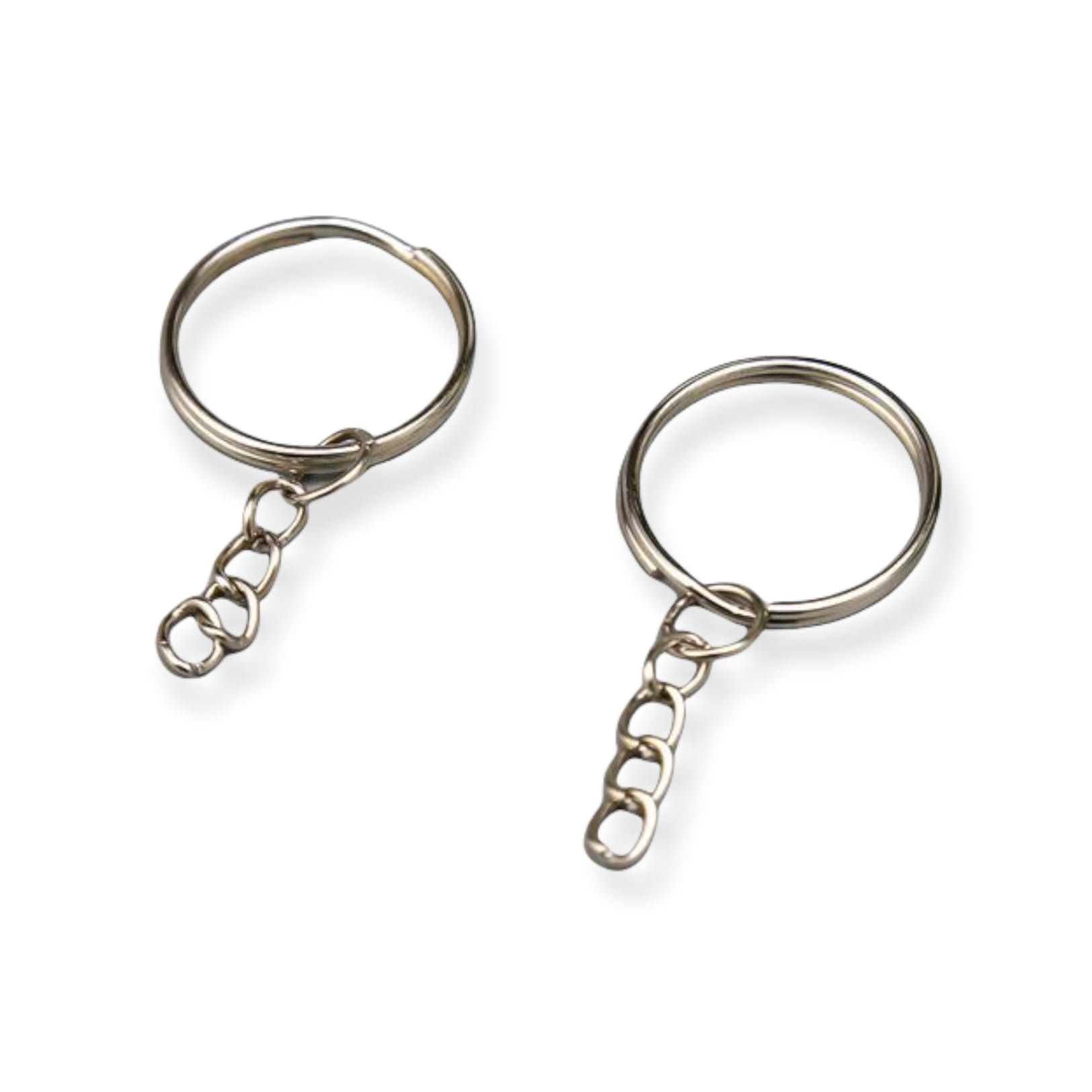 Основа для брелока (брелка) серебристого цвета. Двойное кольцо, в качестве дополнительного декора — цепочка с разъемными звеньями. При желании цепочку можно убрать.