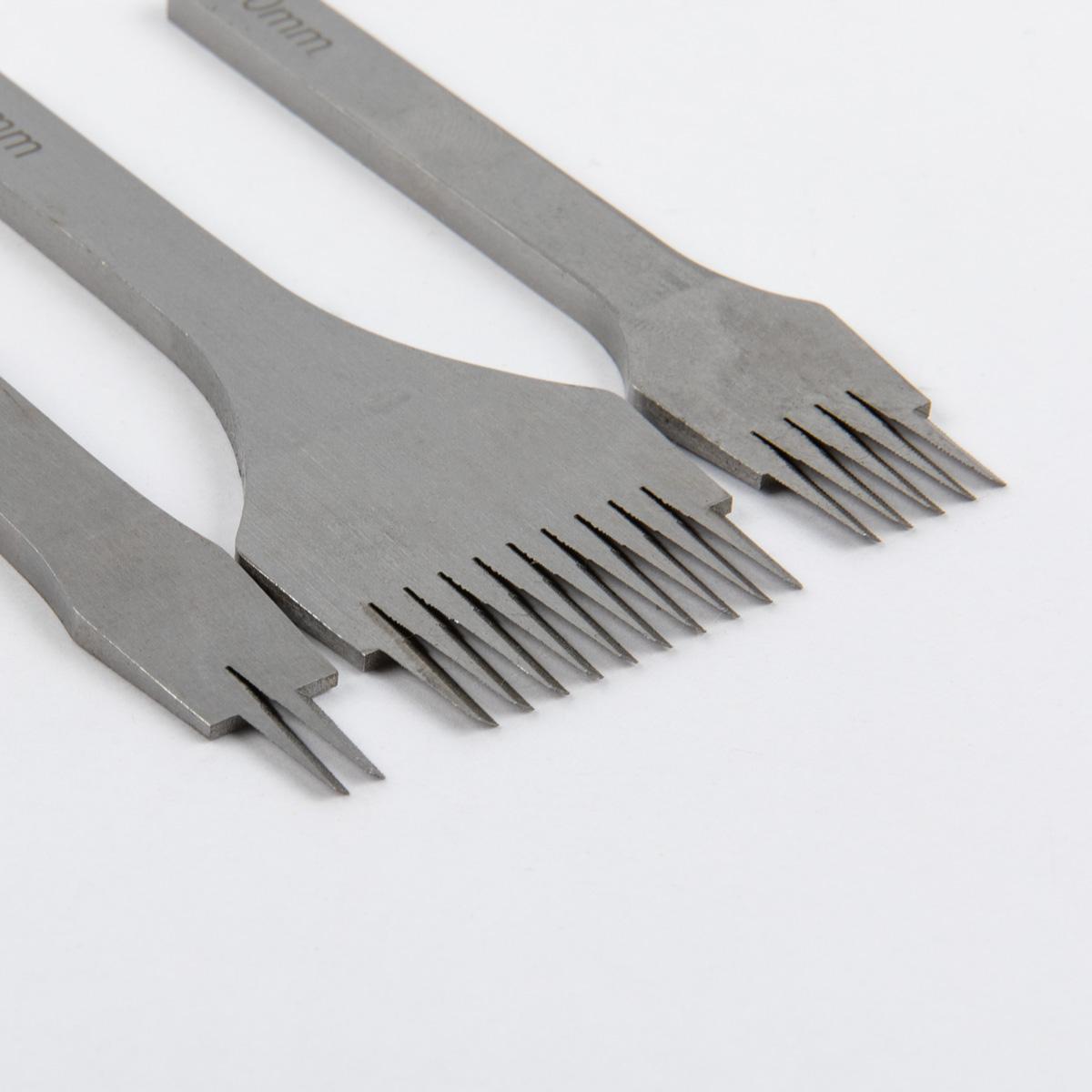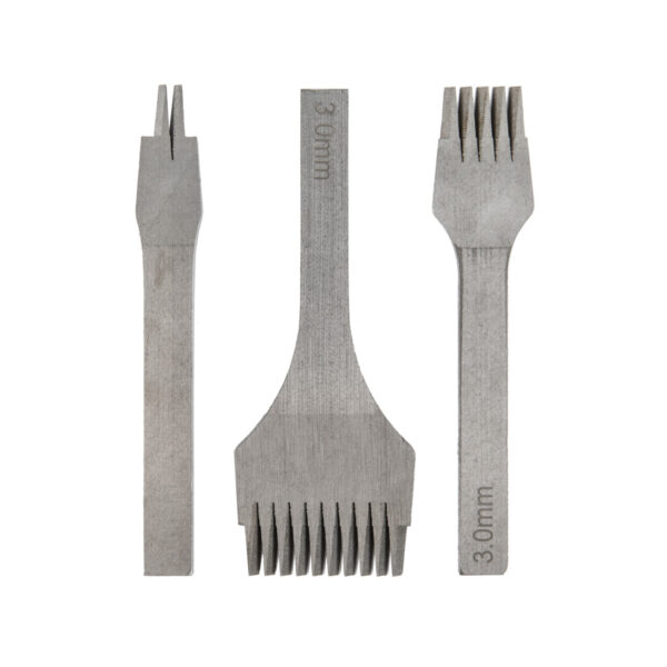 В наборе 3 пробойника с зубцами «французского» типа: 2, 5, 10 зубцов.