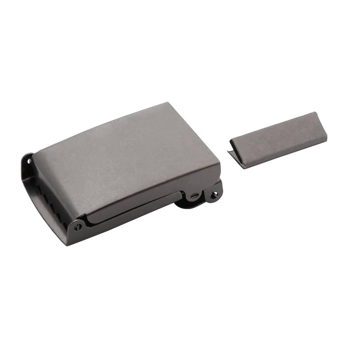 Пряжка выполнена из металла, отличаются способностью выдерживать резкие температурные перепады, интенсивные воздействия (удары и растяжения), характеризуются прочностью и долговечностью. Высокое сопротивление к истиранию имеет большое значение, так как стропа постоянно взаимодействует с пряжкой. Таким образом, данная модель пряжки подходит для предметов, которые подвергаются ударной и весовой нагрузке, а также долго находятся на улице под солнечными лучами и осадками.