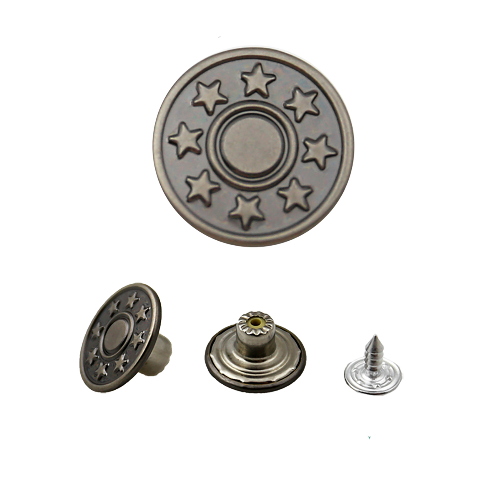 Пуговица джинсовая круглая с рельефной поверхностью, крепится на ткань через прокол маленьким саморезом.