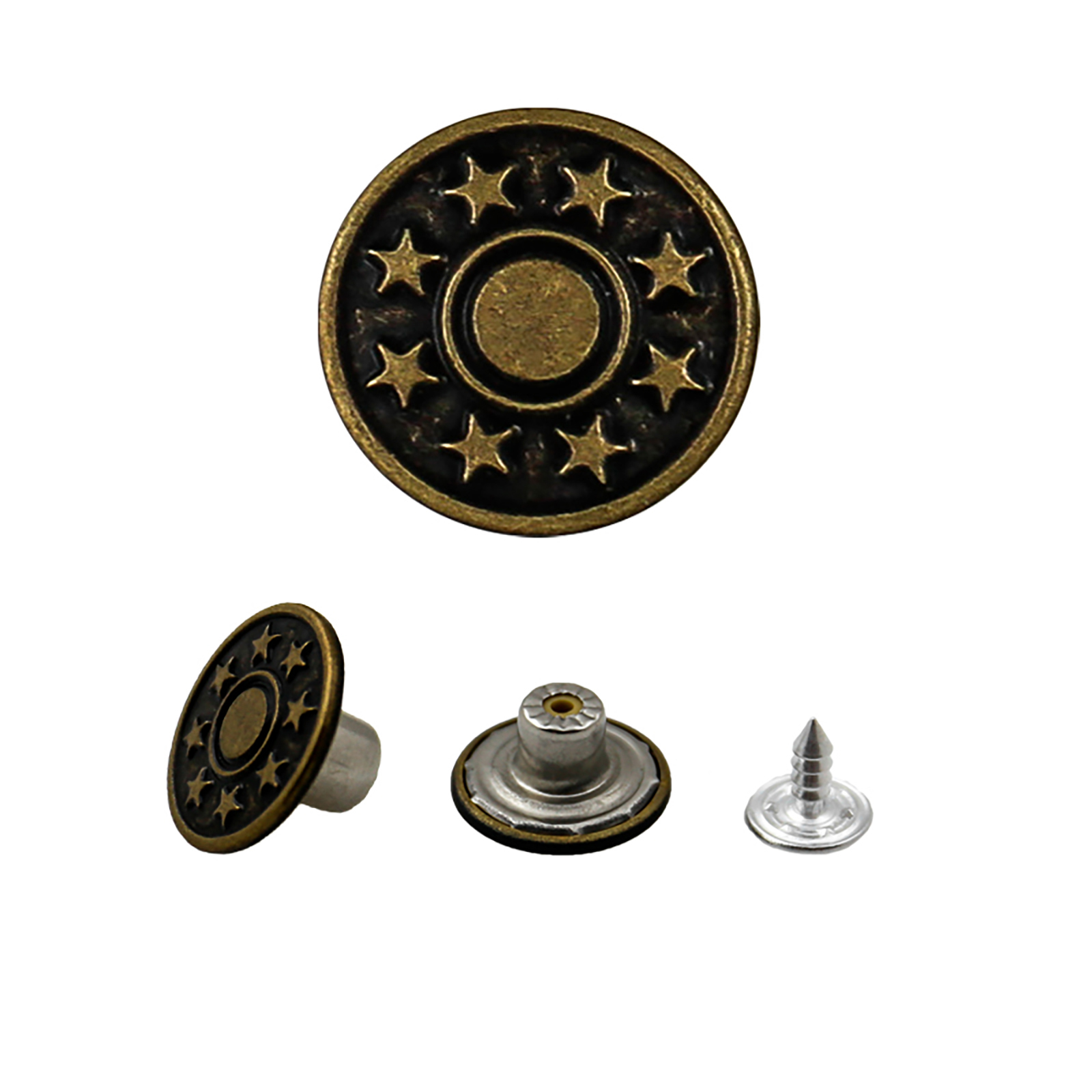 Пуговица джинсовая круглая с рельефной поверхностью, крепится на ткань через прокол маленьким саморезом.
