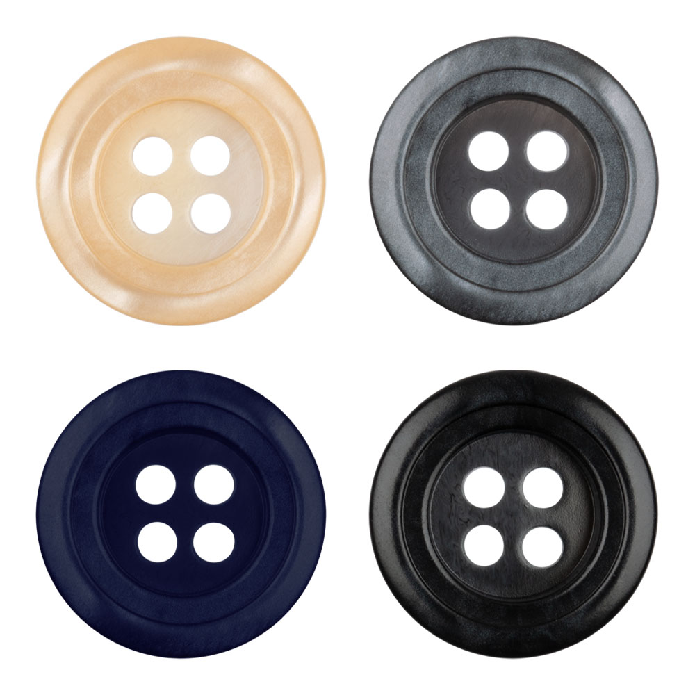 Пластиковая пуговица костюмная ТМ «BLITZ», артикул: DRN 0048 круглая на четыре прокола, диаметром 15 мм.