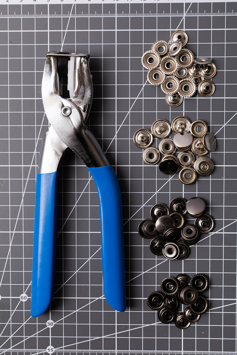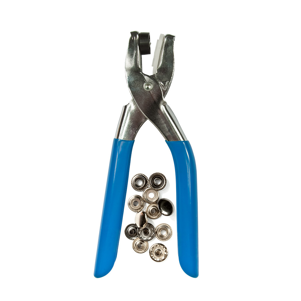 В набор входят: щипцы-пробойник для установки кнопок диаметром 15 мм, 16 комплектов кнопок, состоящих из 4 частей.