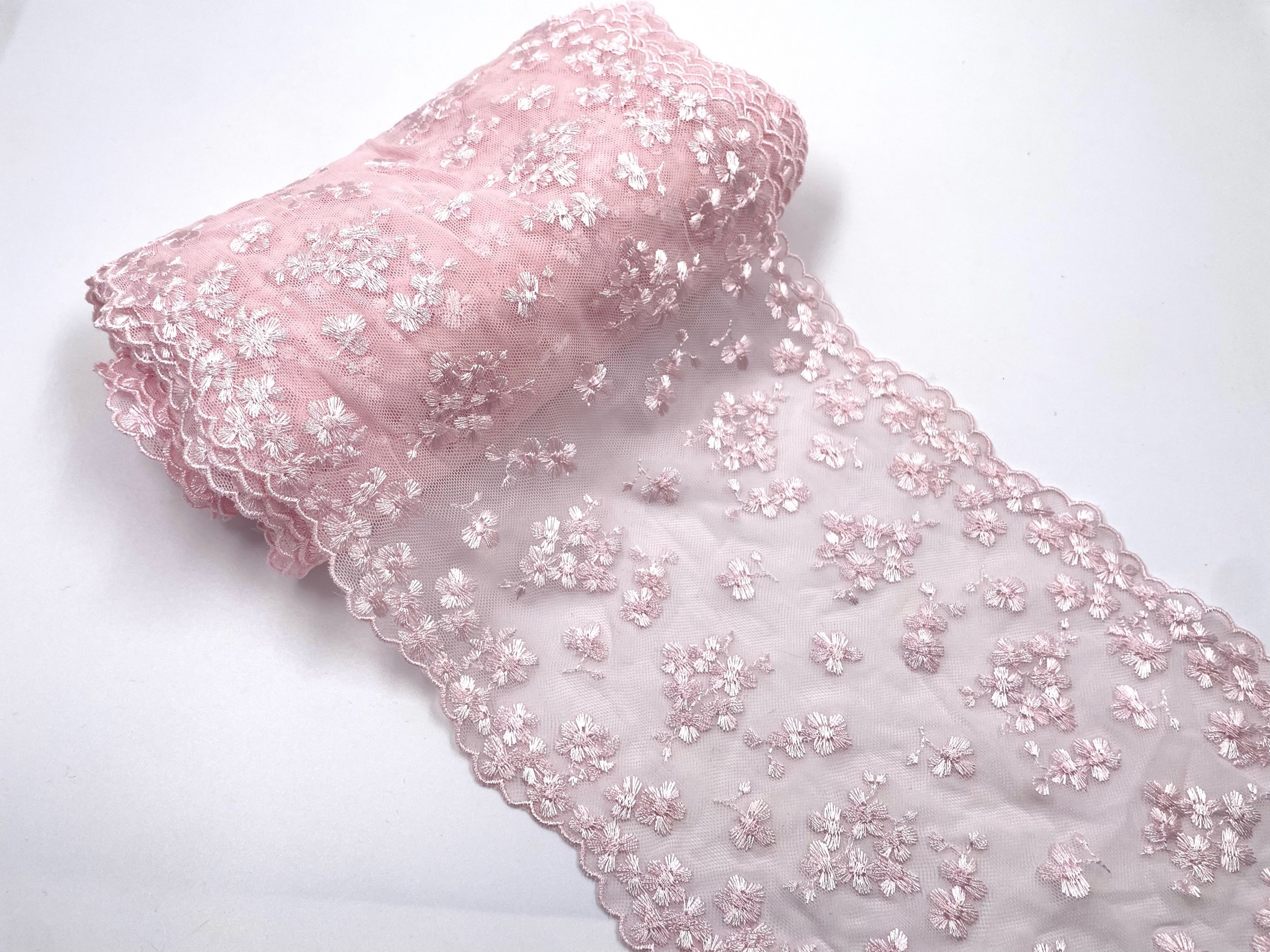 Очень красивое и нежное кружево на мягкой сетке. Воздушное, тонкое, приятное на ощупь. Кружево на сетке подходит, как для шитья, отделки, так и для скрапбукинга, изготовления кукол, свадебных украшений и одежды в стиле эко, бохо и шебби-шик.