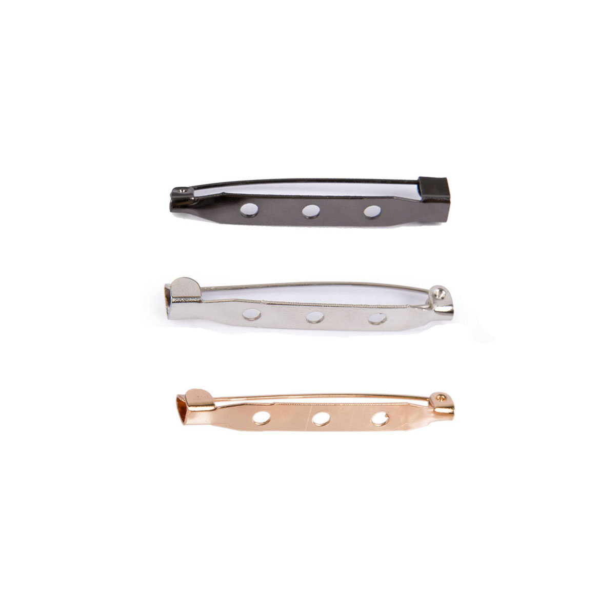 Металлическая заготовка для броши размером 4 см, имеет три отверстия в основании и поворачивающийся фиксатор иглы. Крепление различных дополнительных элементов и дополнительных оснований может осуществляться при помощи клея или специальных отверстий. Вкачестве декора могут быть использованы бисер, бусины, полимерная глина, лента, стразы и другие элементы.